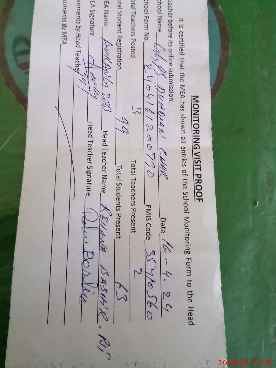 | Attendance Register | Head Teacher | MEA with School | Visit Proof |