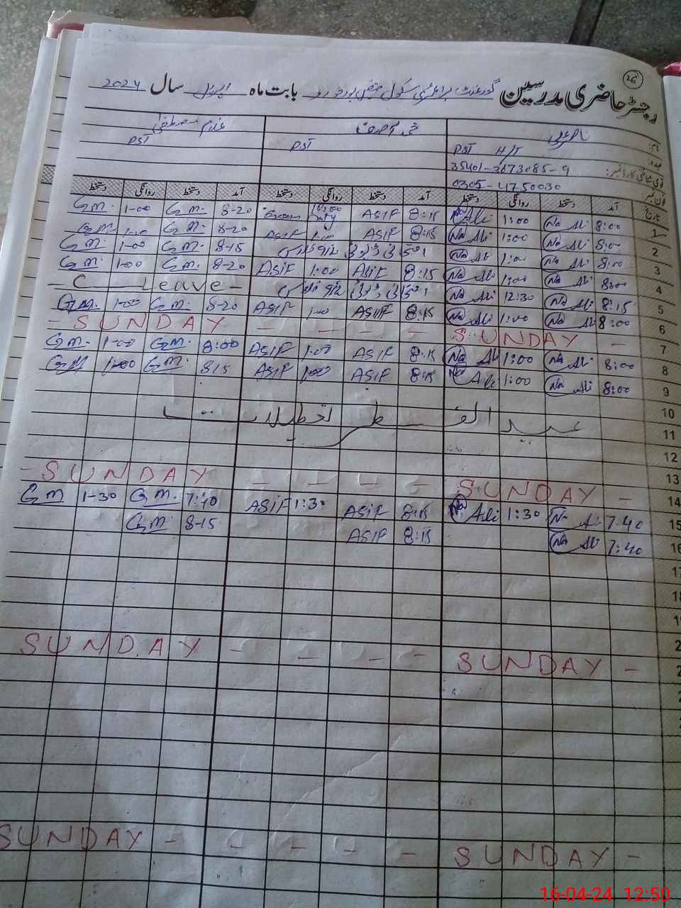 | CNIC | Full Name | Designation | R/C | Absence During Last Calender Month |