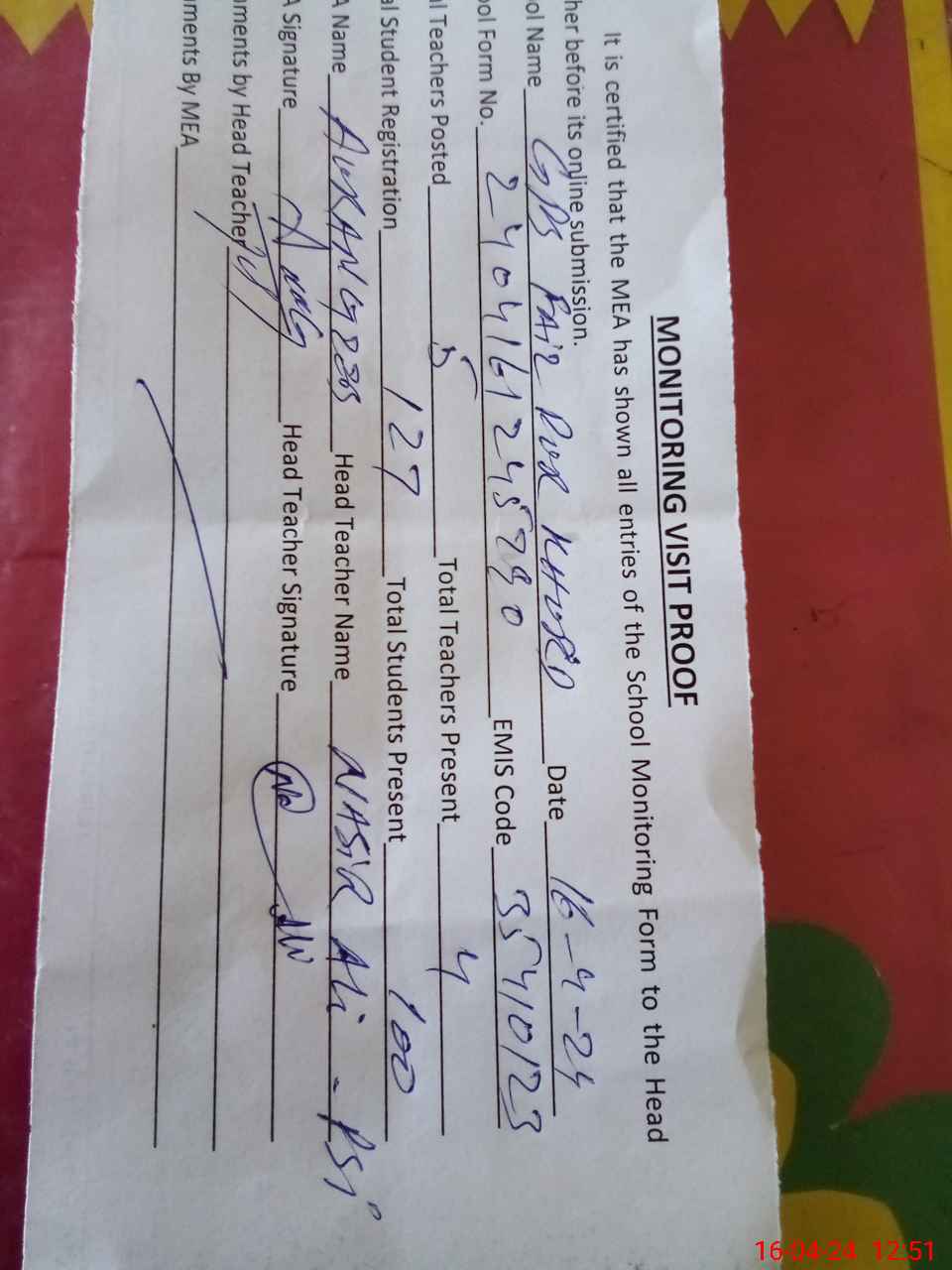 | Attendance Register | Head Teacher | MEA with School | Visit Proof |