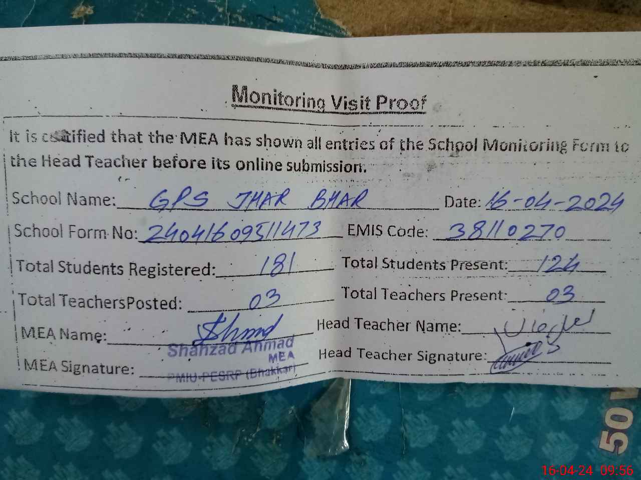 | EMIS Code: 38110270 | Name of School: GPS JHAR BHAR | |||