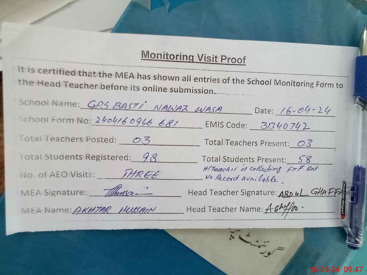 | Attendance Register | Head Teacher | MEA with School | Visit Proof |
