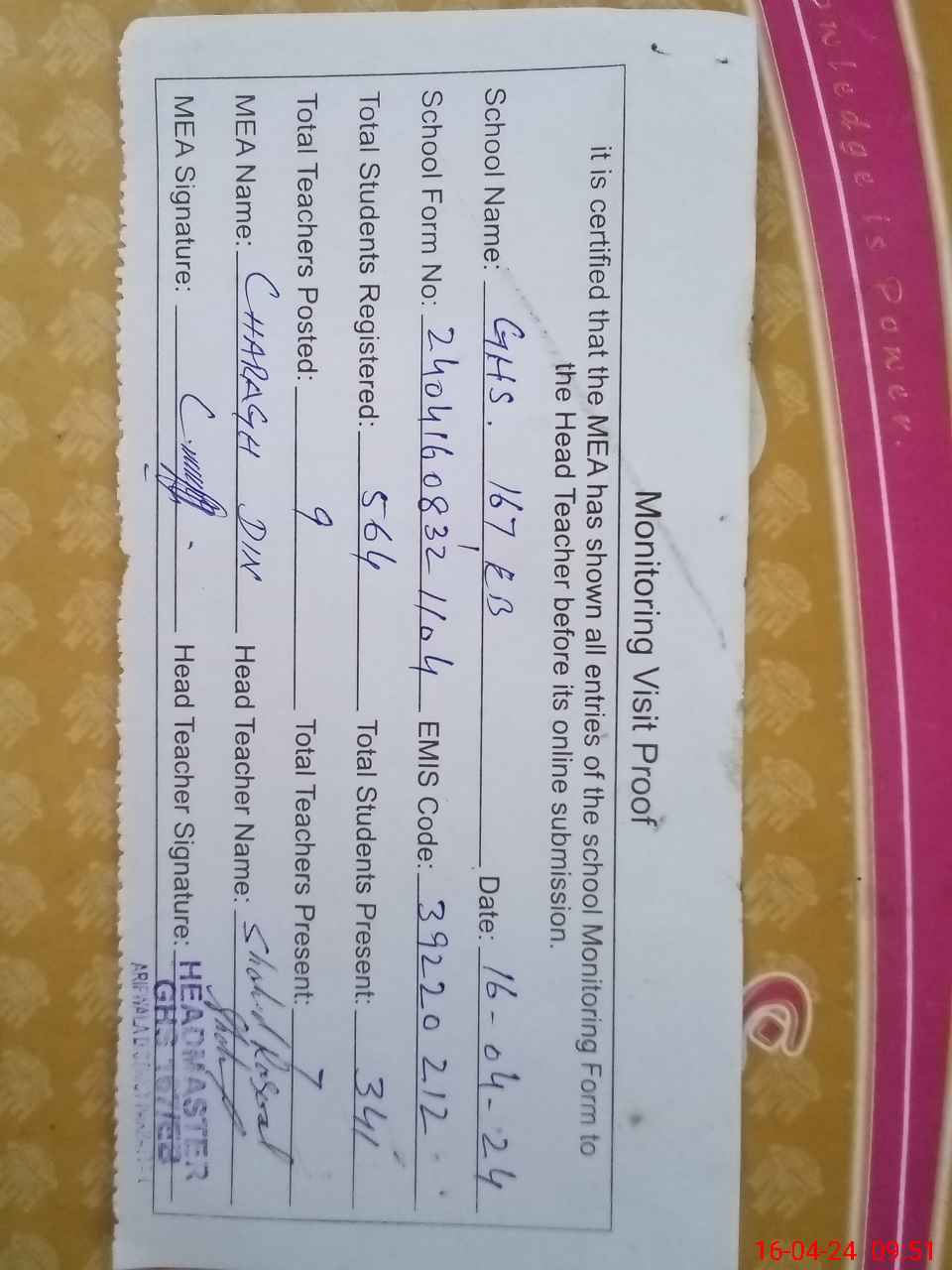 | Attendance Register | Head Teacher | MEA with School | Visit Proof |