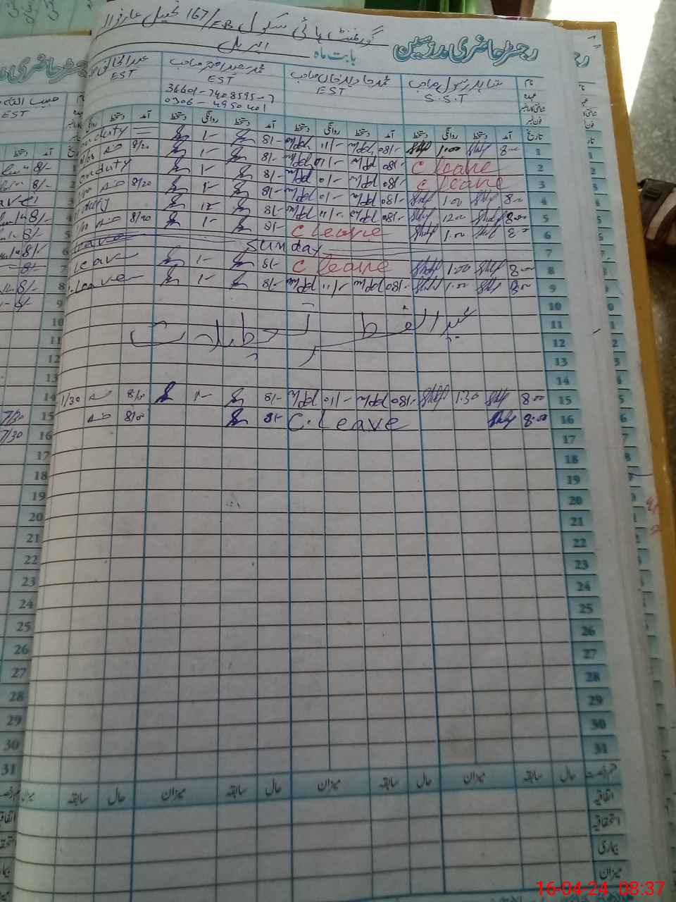 | CNIC | Full Name | Designation | R/C | Absence During Last Calender Month |
