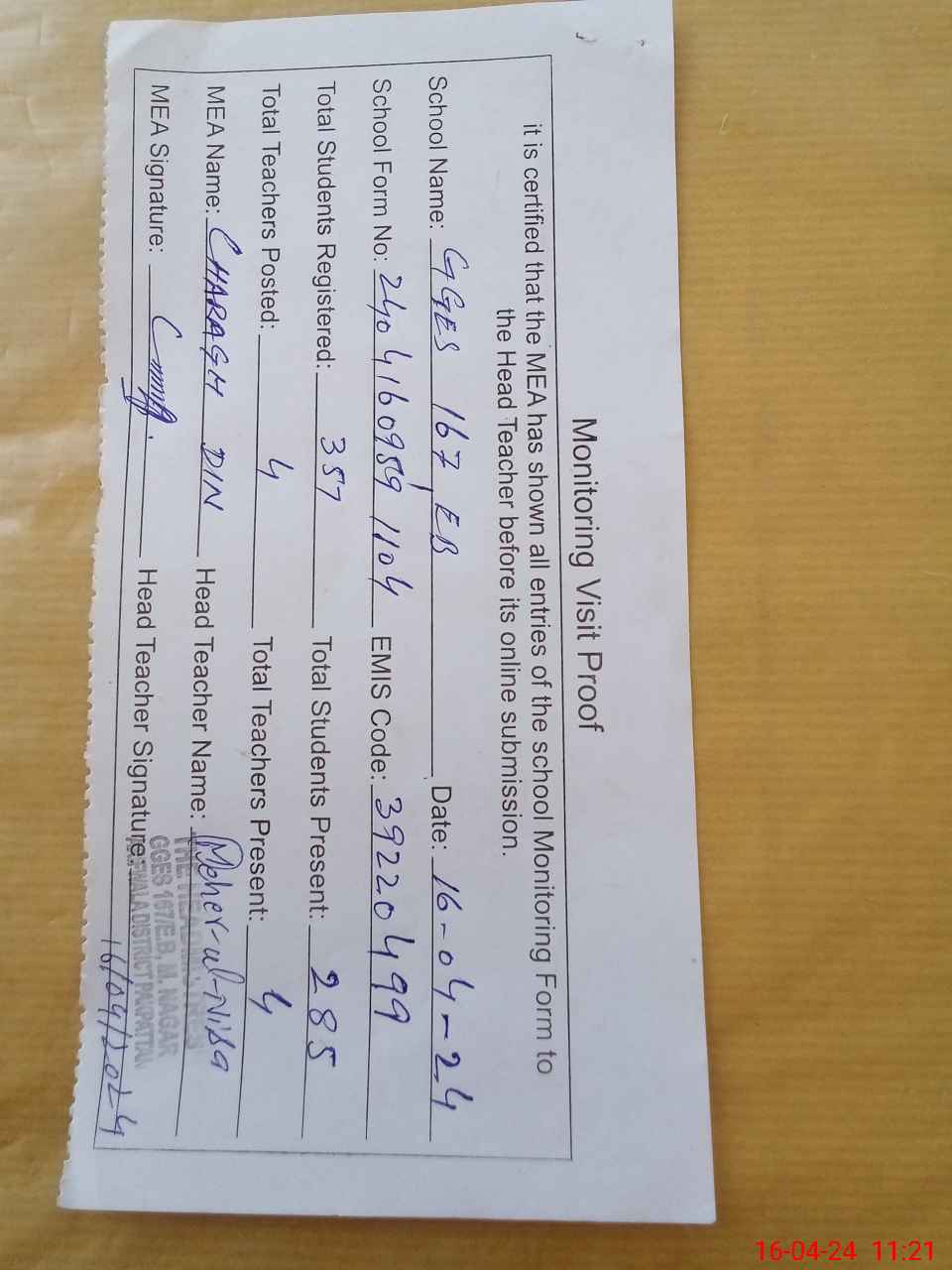 | EMIS Code: 39220499 | Name of School: GGES CHAK NO.167 EB | |||