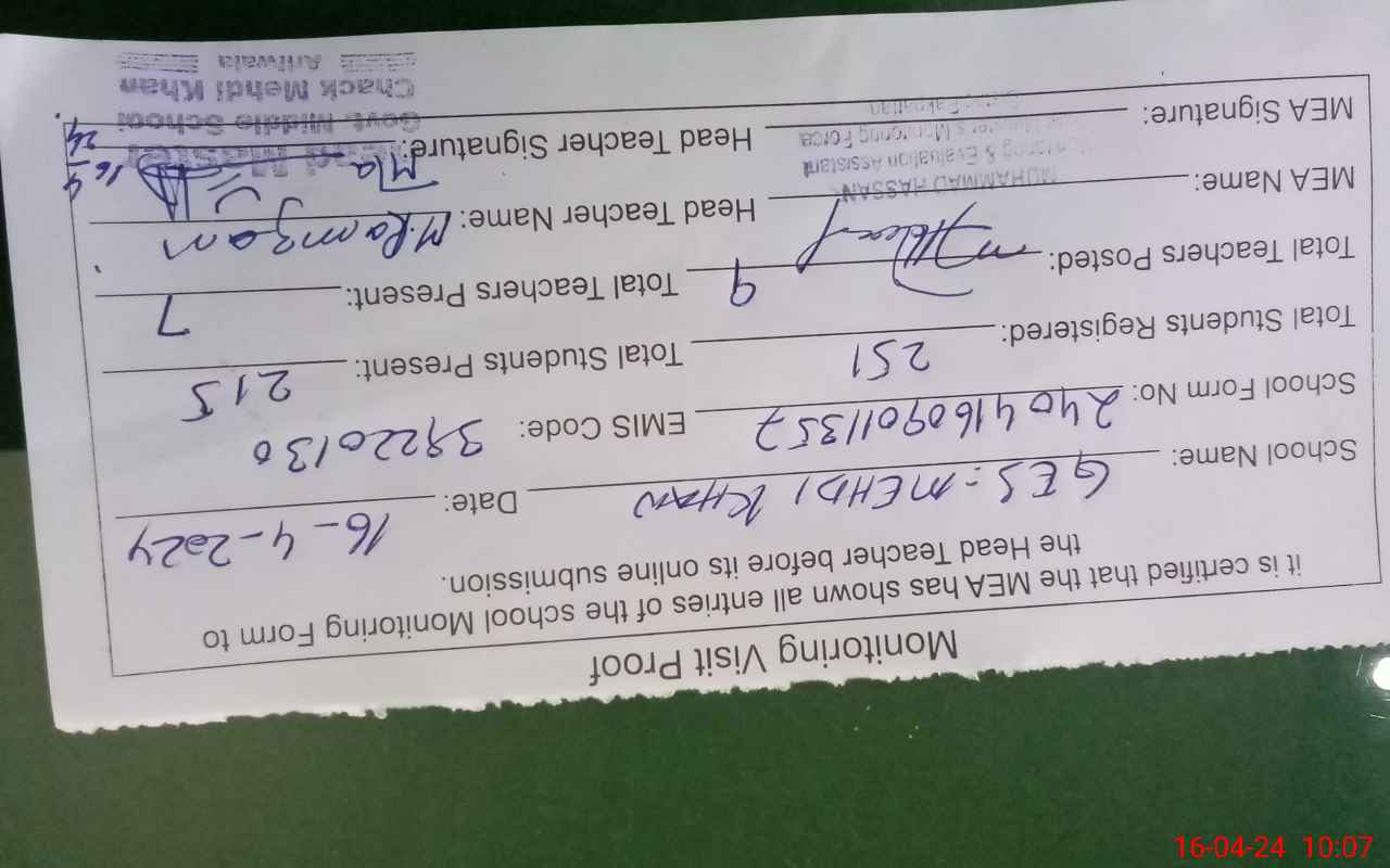 | Attendance Register | Head Teacher | MEA with School | Visit Proof |