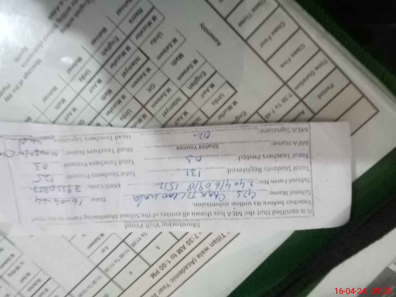 | Monitoring Date: 16-04-2024 | Start Time: 16-04-2024 09:18 AM | End Time: 16-04-2024 09:28 AM | Name of MEA: SH**** YO**** | |