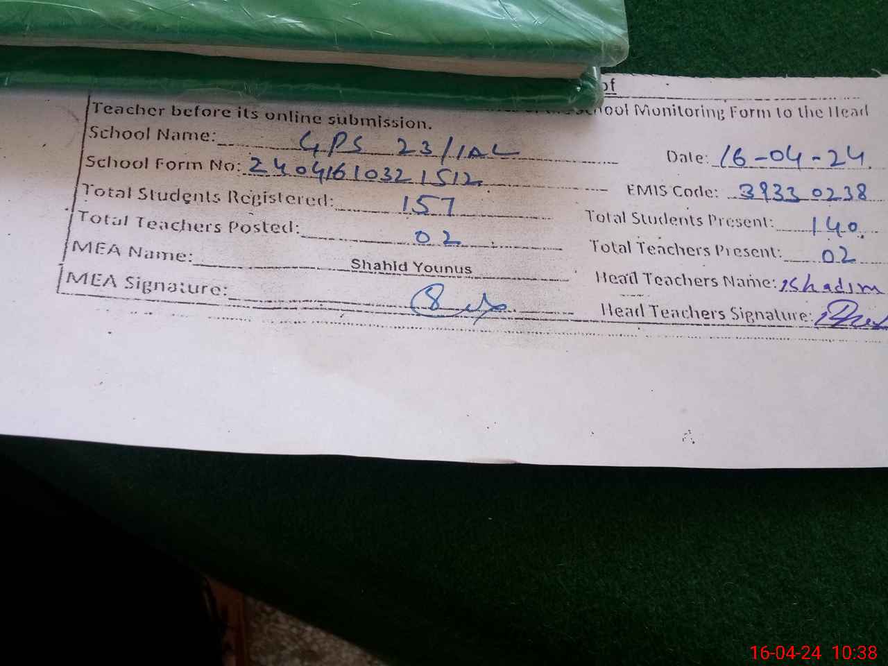 | Attendance Register | Head Teacher | MEA with School | Visit Proof |