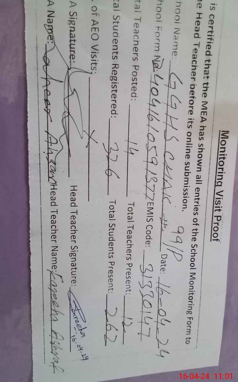 | EMIS Code: 31330147 | Name of School: GGHS CHAK NO. 99/P | |||