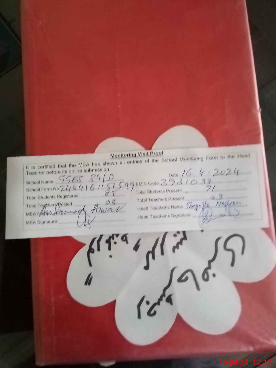 | Attendance Register | Head Teacher | MEA with School | Visit Proof |