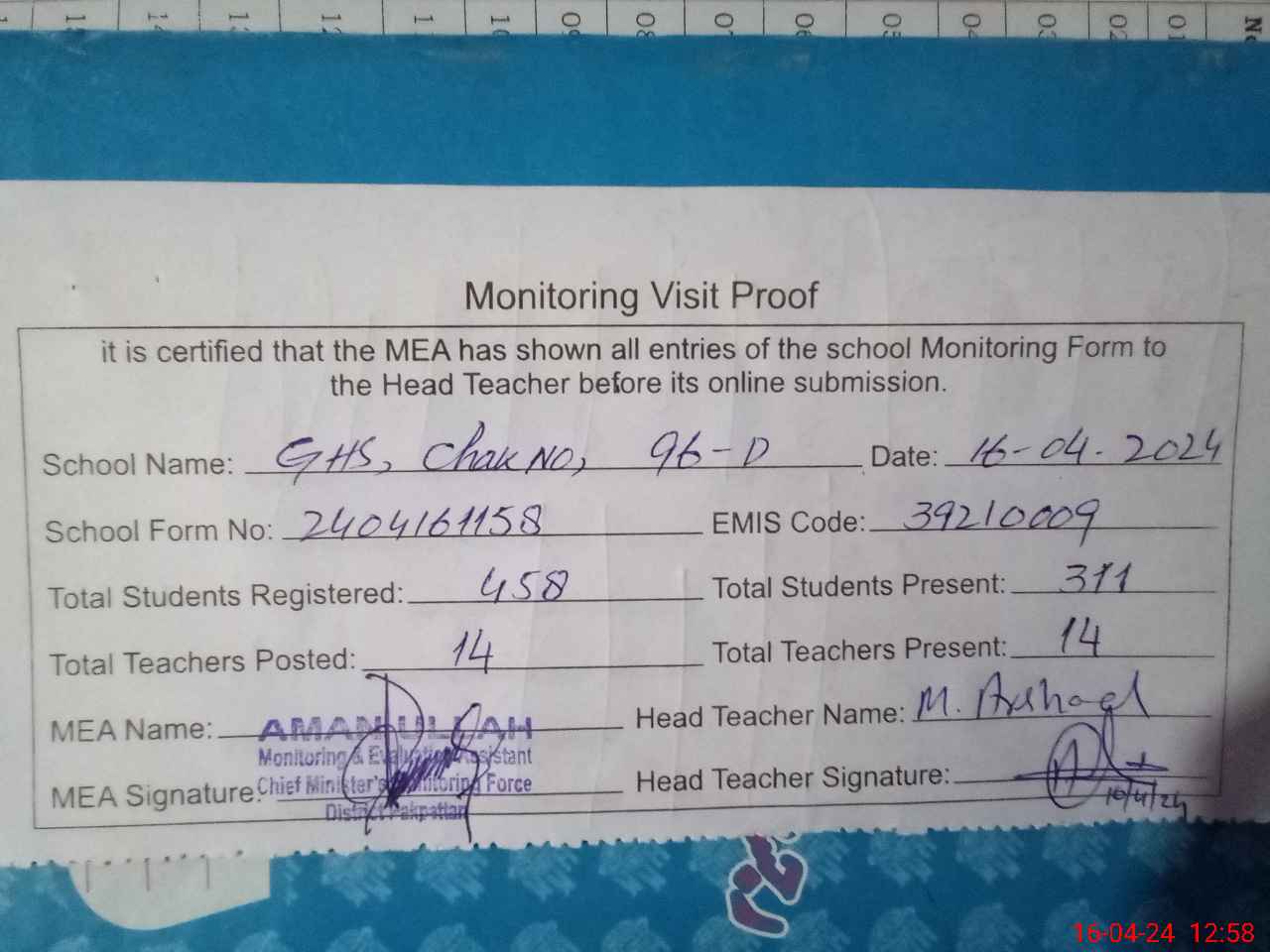 | Attendance Register | Head Teacher | MEA with School | Visit Proof |