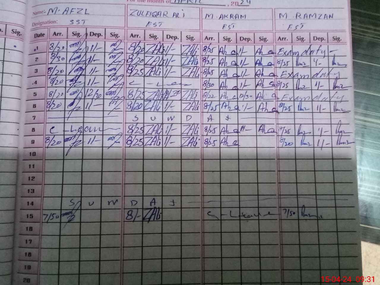 | CNIC | Full Name | Designation | R/C | Absence During Last Calender Month |