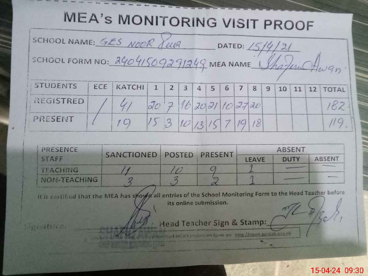 | Attendance Register | Head Teacher | MEA with School | Visit Proof |