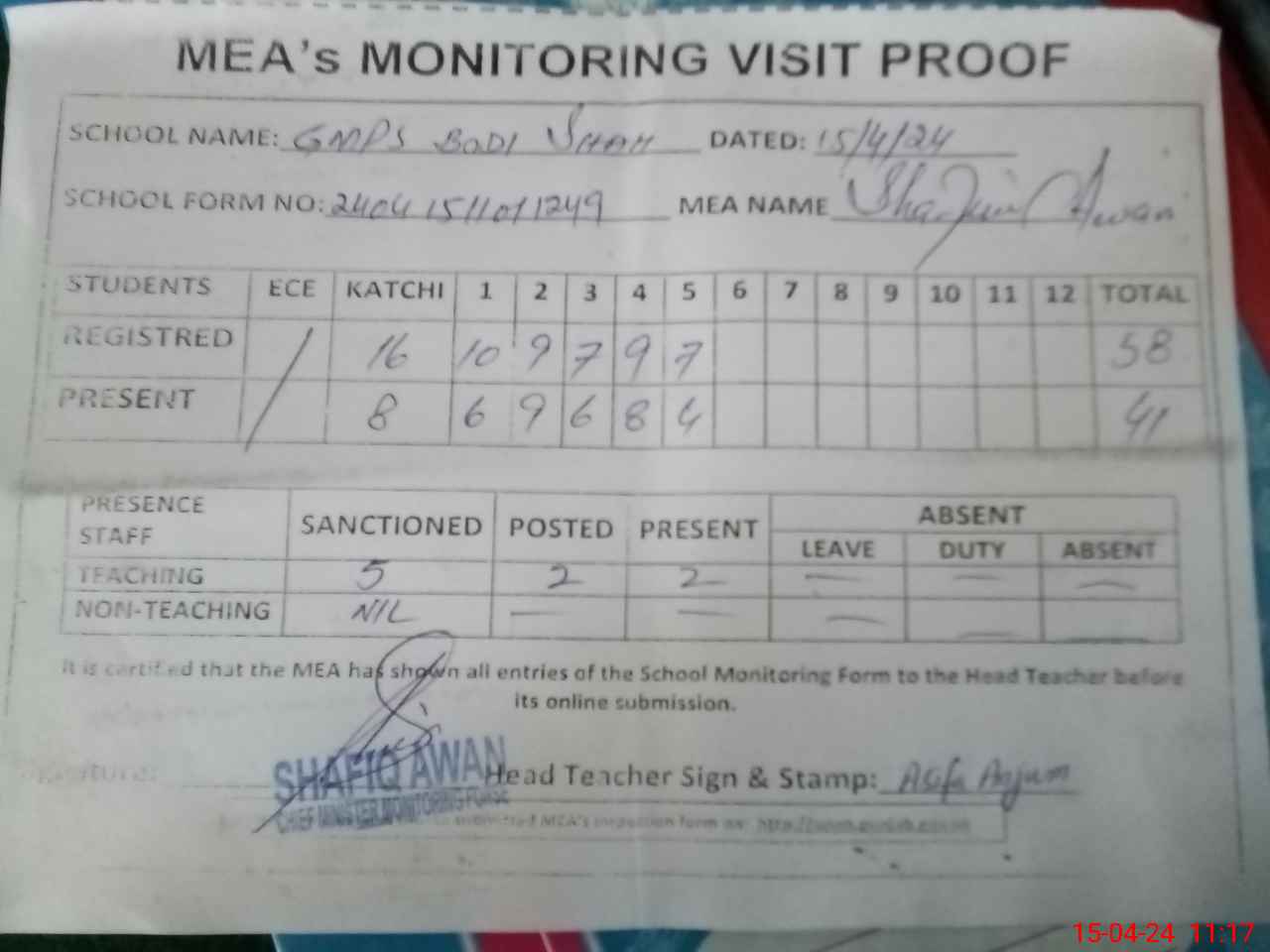 | Attendance Register | Head Teacher | MEA with School | Visit Proof |