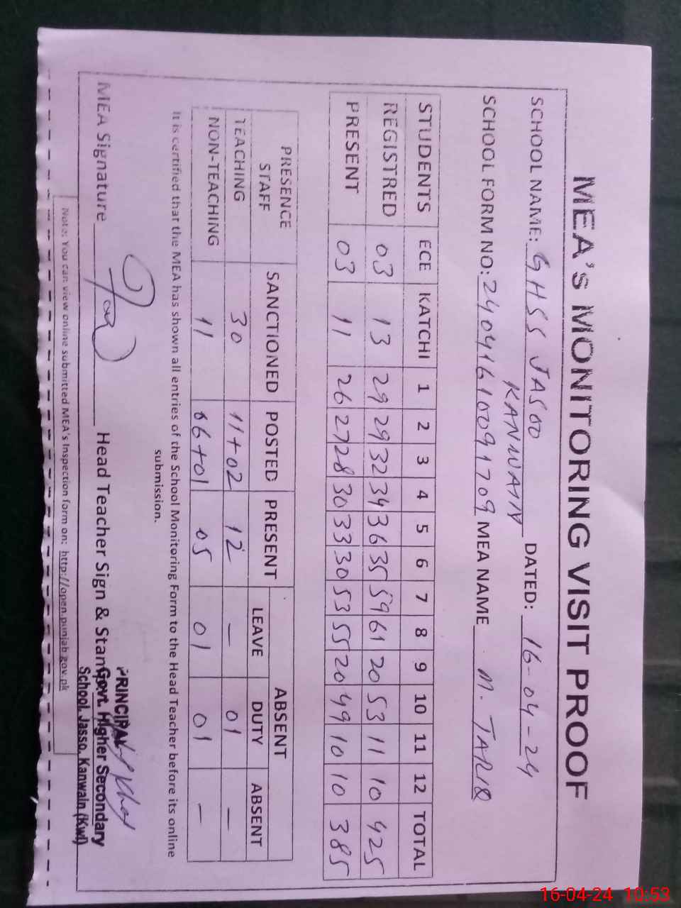 | EMIS Code: 36410019 | Name of School: GHSS JASSO KANWAIN SARAI SIDHU | |||