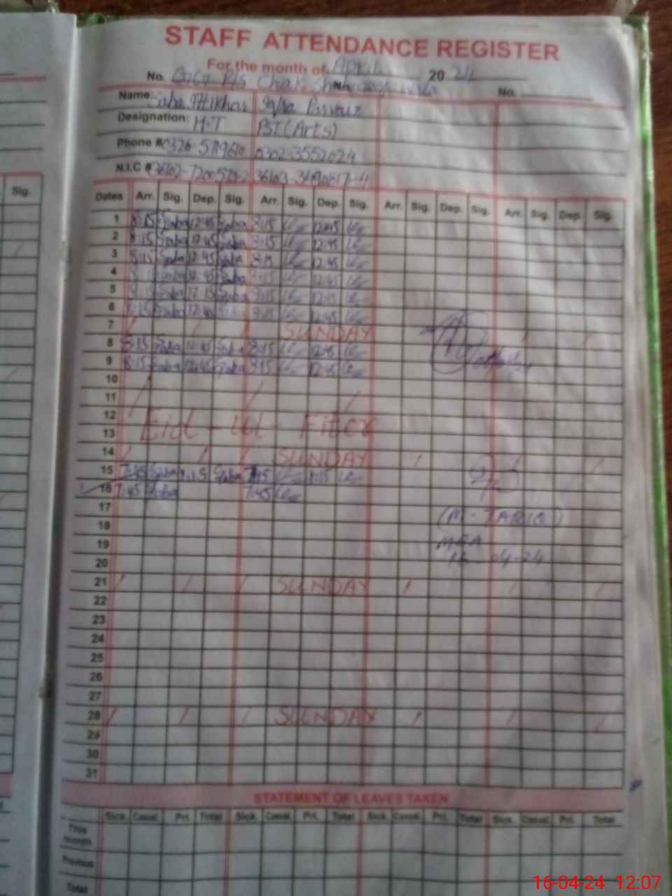 | Name: SA**** IF**** Designation: (School Headmaster's/Headmistress's) ESE (SCI-MATH) Phone/Cell Number: 03**** |