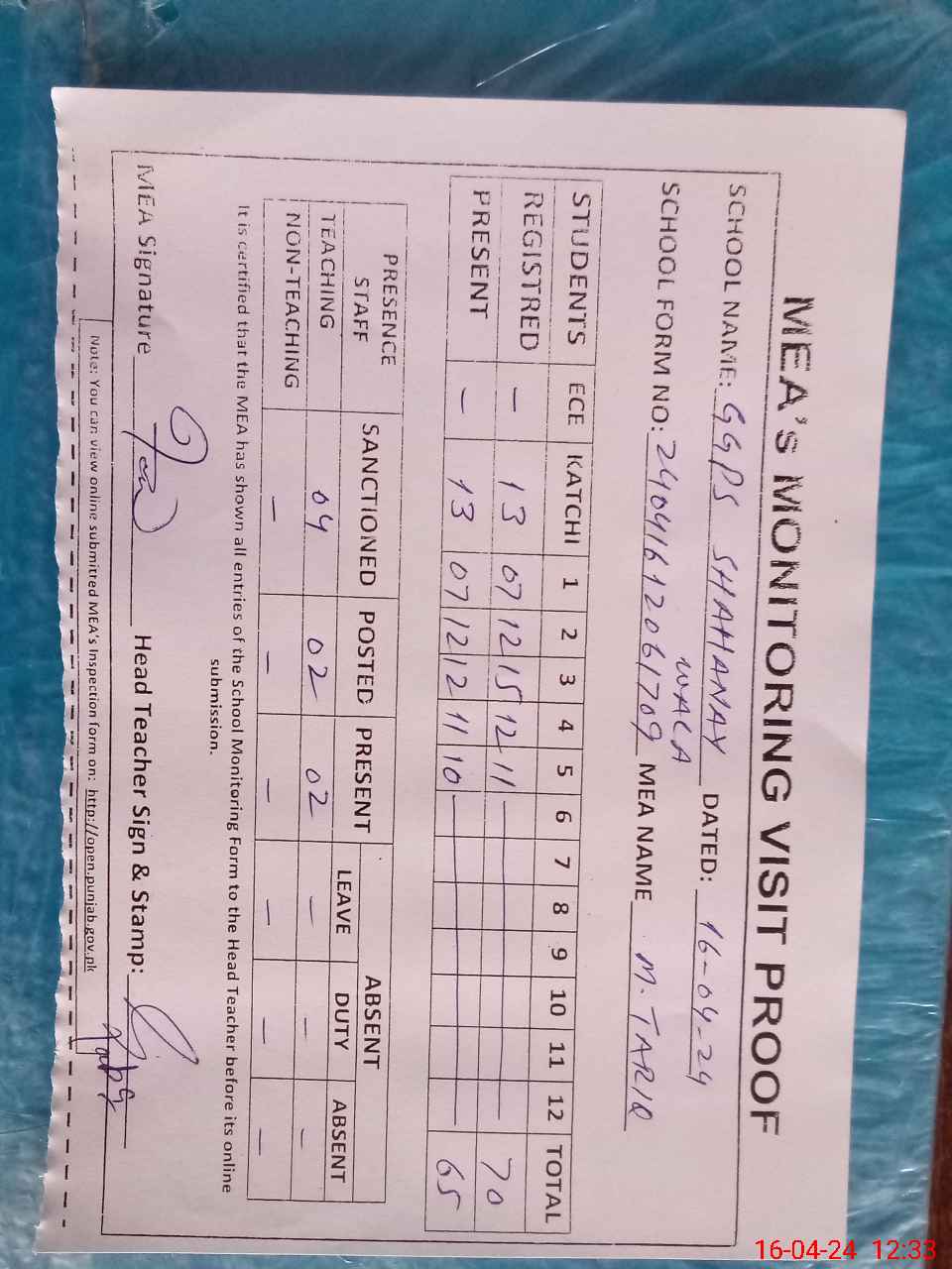 | Attendance Register | Head Teacher | MEA with School | Visit Proof |