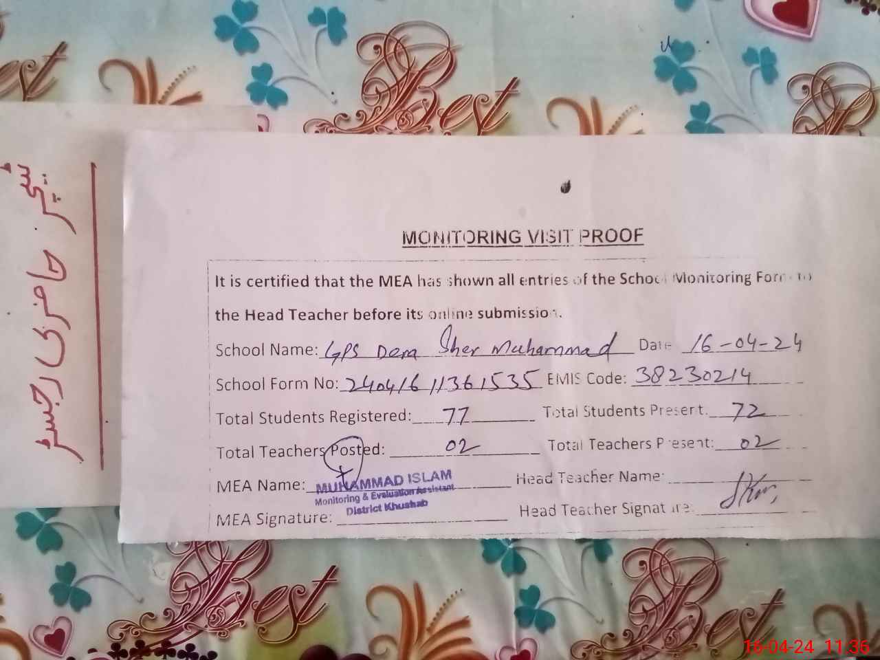 | EMIS Code: 38230214 | Name of School: GPS DERA SHER MUHAMMAD WALA | |||