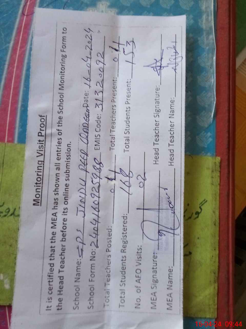 | Attendance Register | Head Teacher | MEA with School | Visit Proof |
