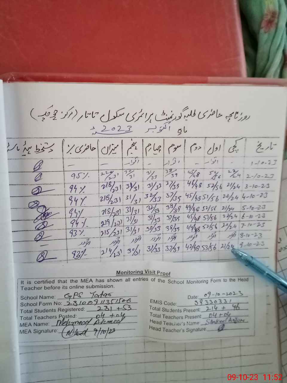| Attendance Register | Head Teacher | MEA with School | Visit Proof |
