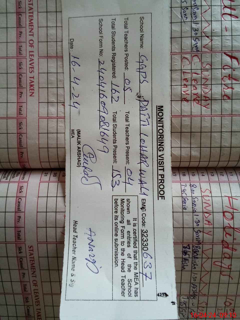 | Attendance Register | Head Teacher | MEA with School | Visit Proof |