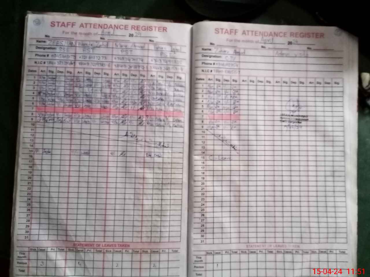| CNIC | Full Name | Designation | R/C | Absence During Last Calender Month |