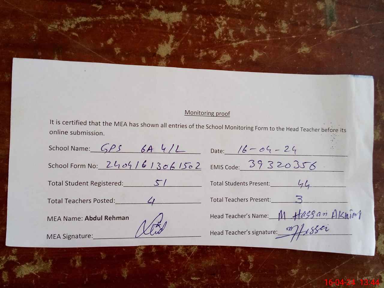 | Attendance Register | Head Teacher | MEA with School | Visit Proof |