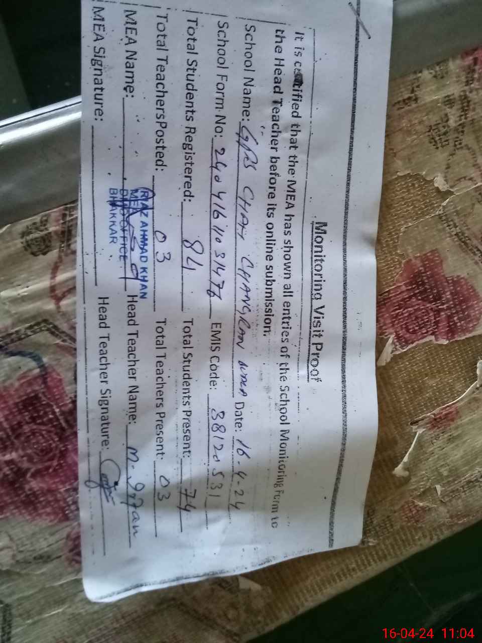 | Name: MU**** IR**** Designation: (School Headmaster's/Headmistress's) ESE Phone/Cell Number: 03**** |
