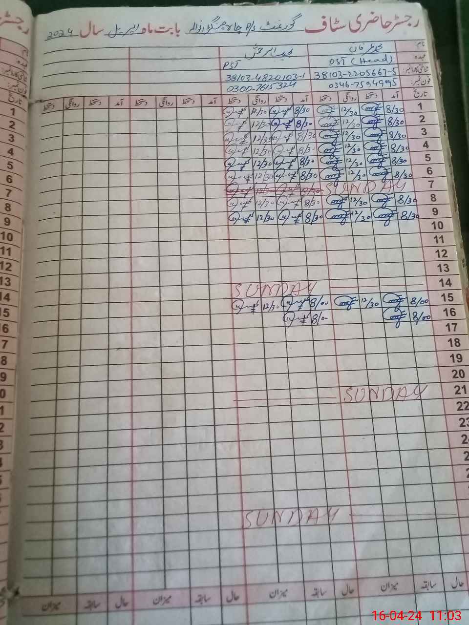 | CNIC | Full Name | Designation | R/C | Absence During Last Calender Month |