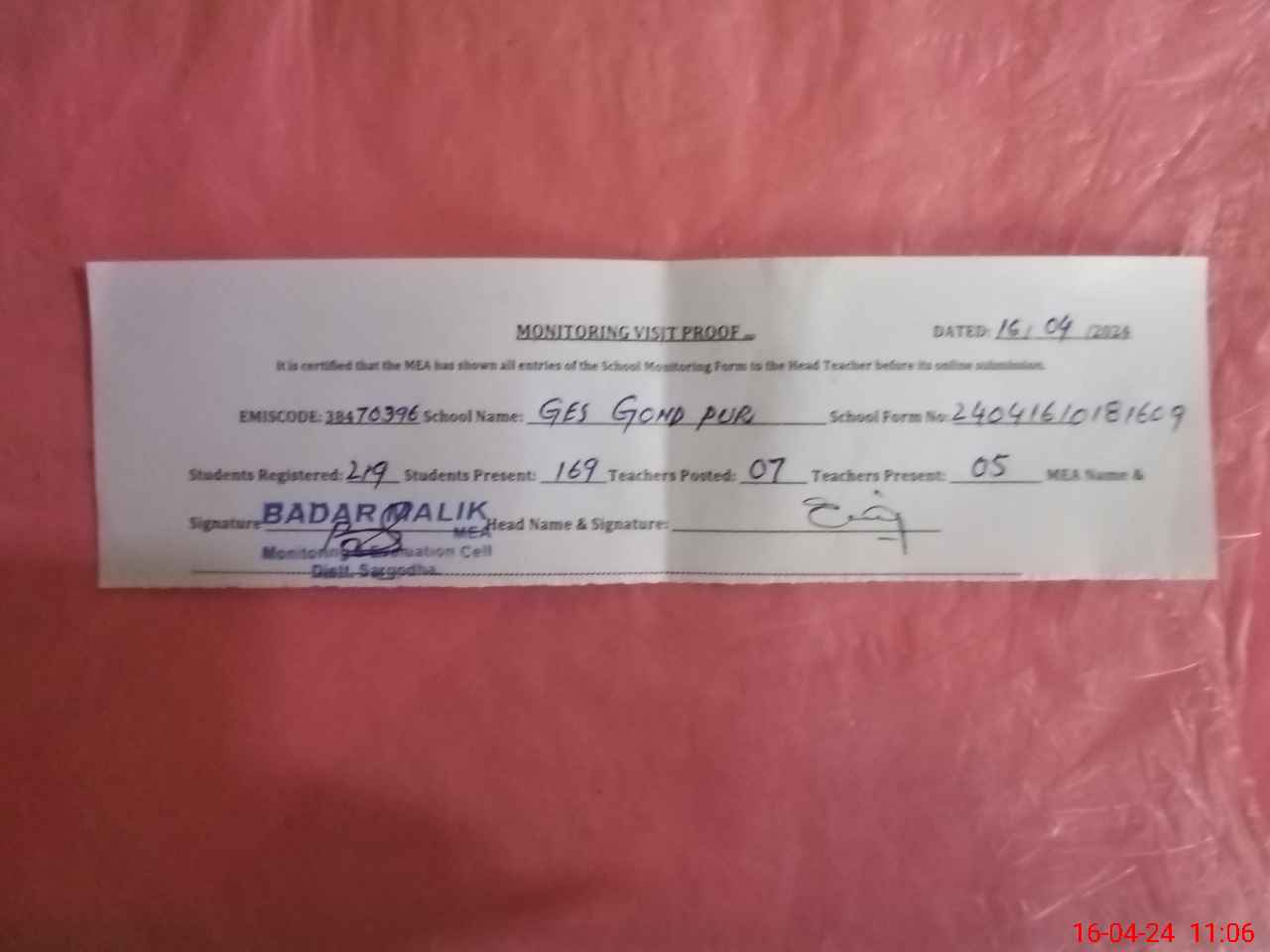 | Attendance Register | Head Teacher | MEA with School | Visit Proof |