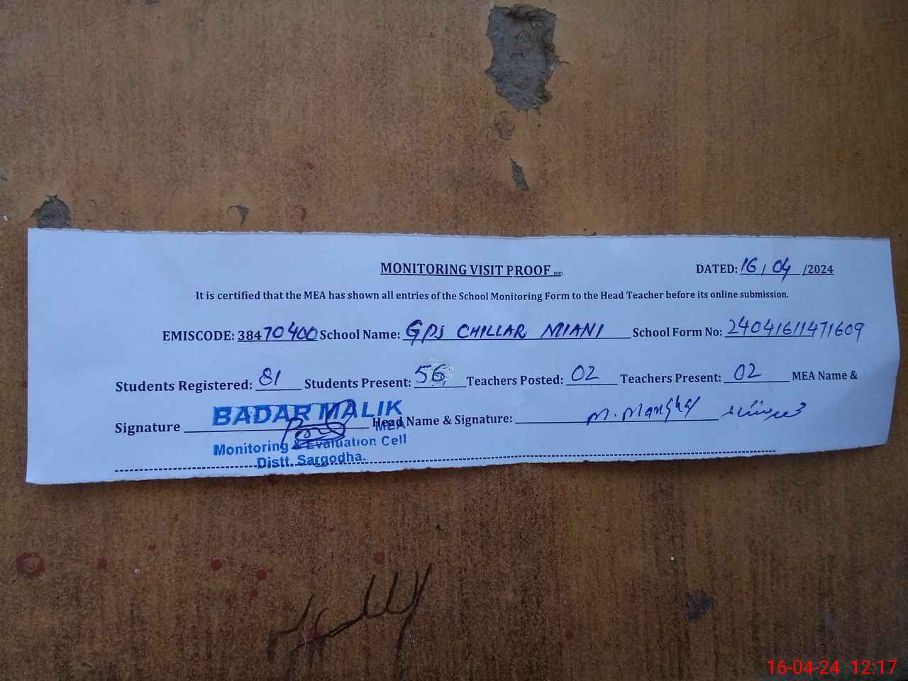| EMIS Code: 38470400 | Name of School: GPS CHILLAR MIANI | |||