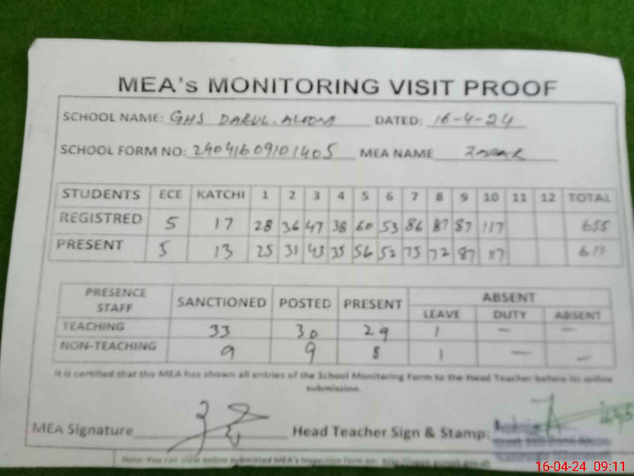 | Attendance Register | Head Teacher | MEA with School | Visit Proof |