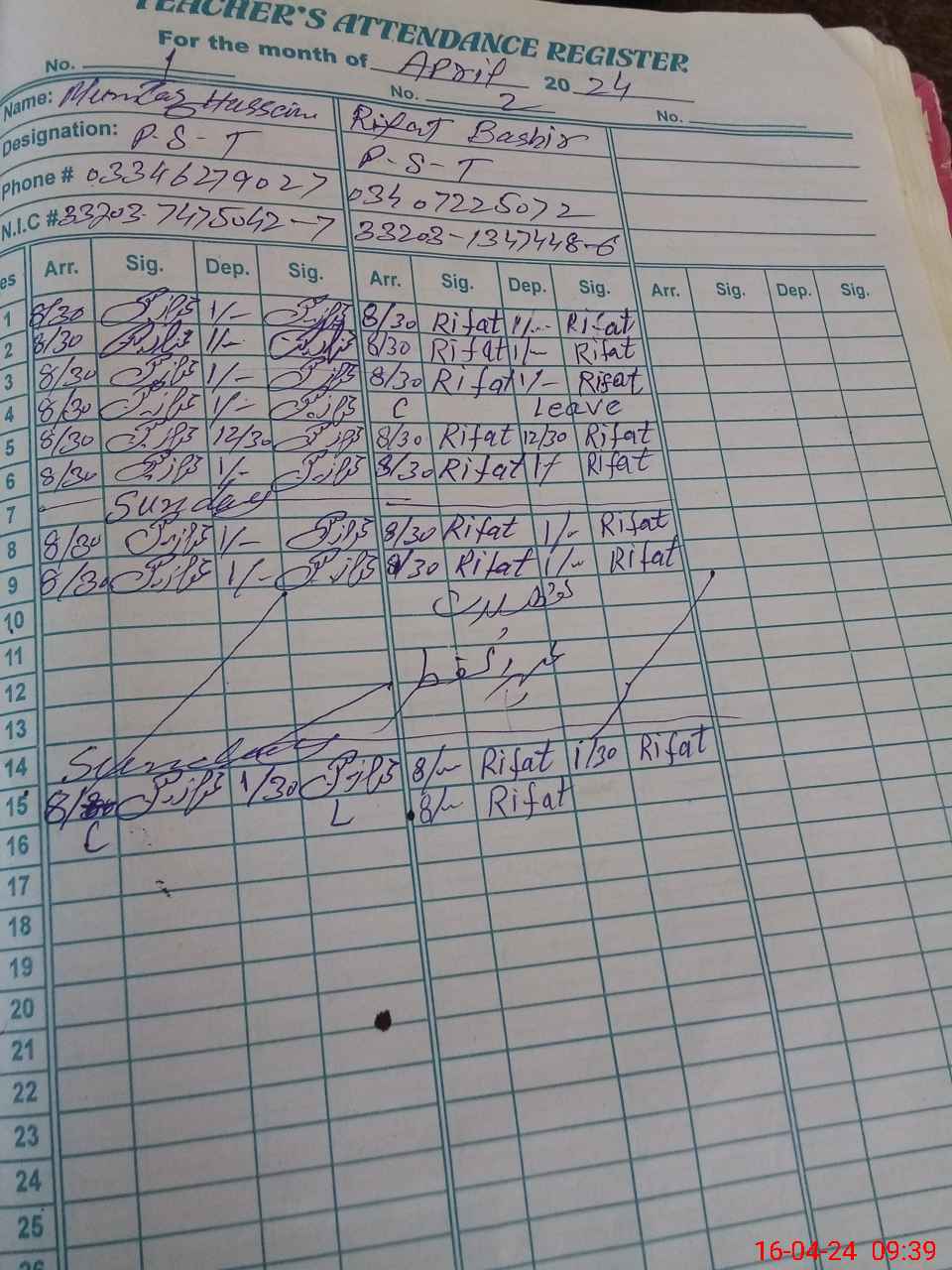 | CNIC | Full Name | Designation | R/C | Absence During Last Calender Month |