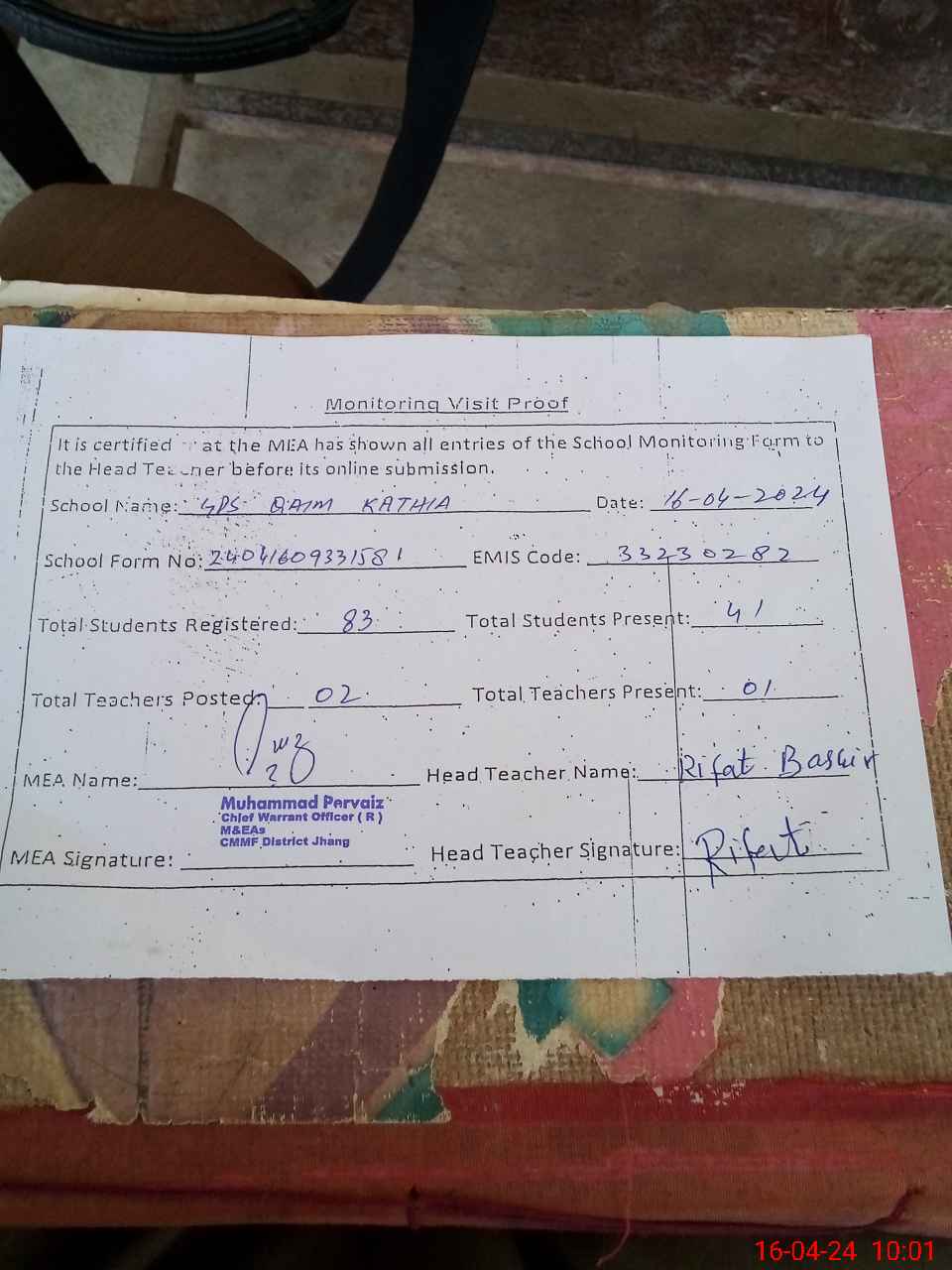 | Certified that this School was Inspected by the Undersigned MEA/DMO Today and the Information Stated Above is as Per Record. | |||||