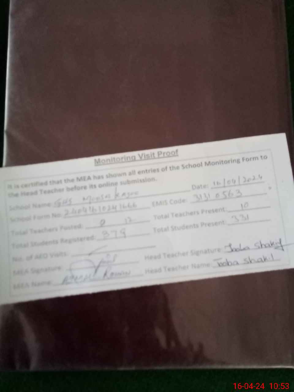 | Attendance Register | Head Teacher | MEA with School | Visit Proof |