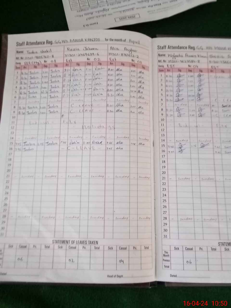 | CNIC | Full Name | Designation | R/C | Absence During Last Calender Month |