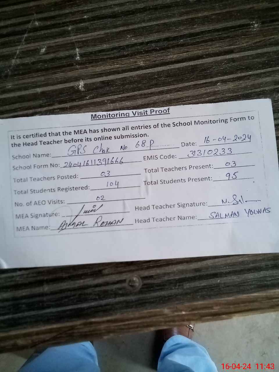 | Attendance Register | Head Teacher | MEA with School | Visit Proof |