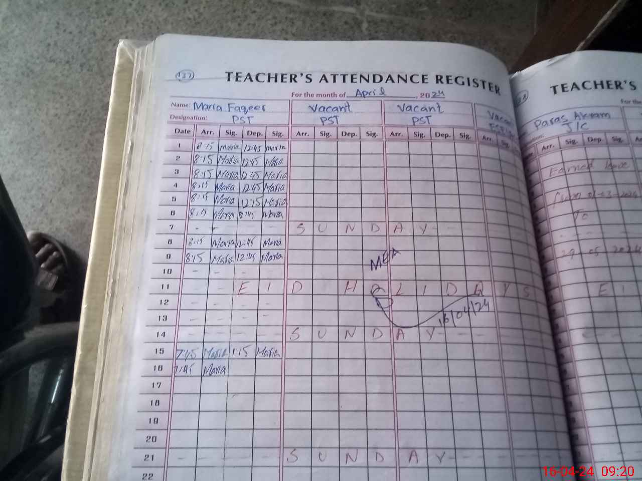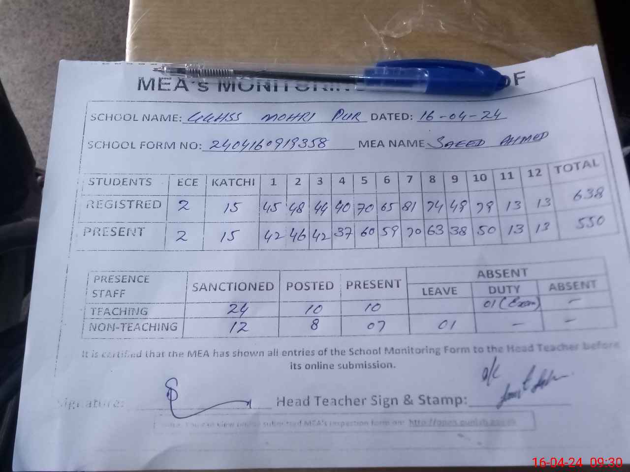 | Attendance Register | Head Teacher | MEA with School | Visit Proof |