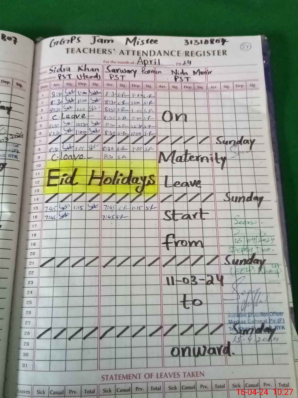 | Leave | Duty | Absent | Maternity | Medical | Ex- Pak |