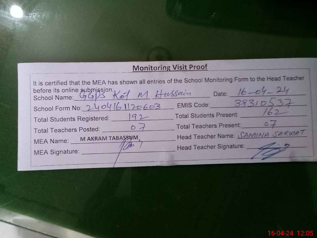 | Attendance Register | Head Teacher | MEA with School | Visit Proof |