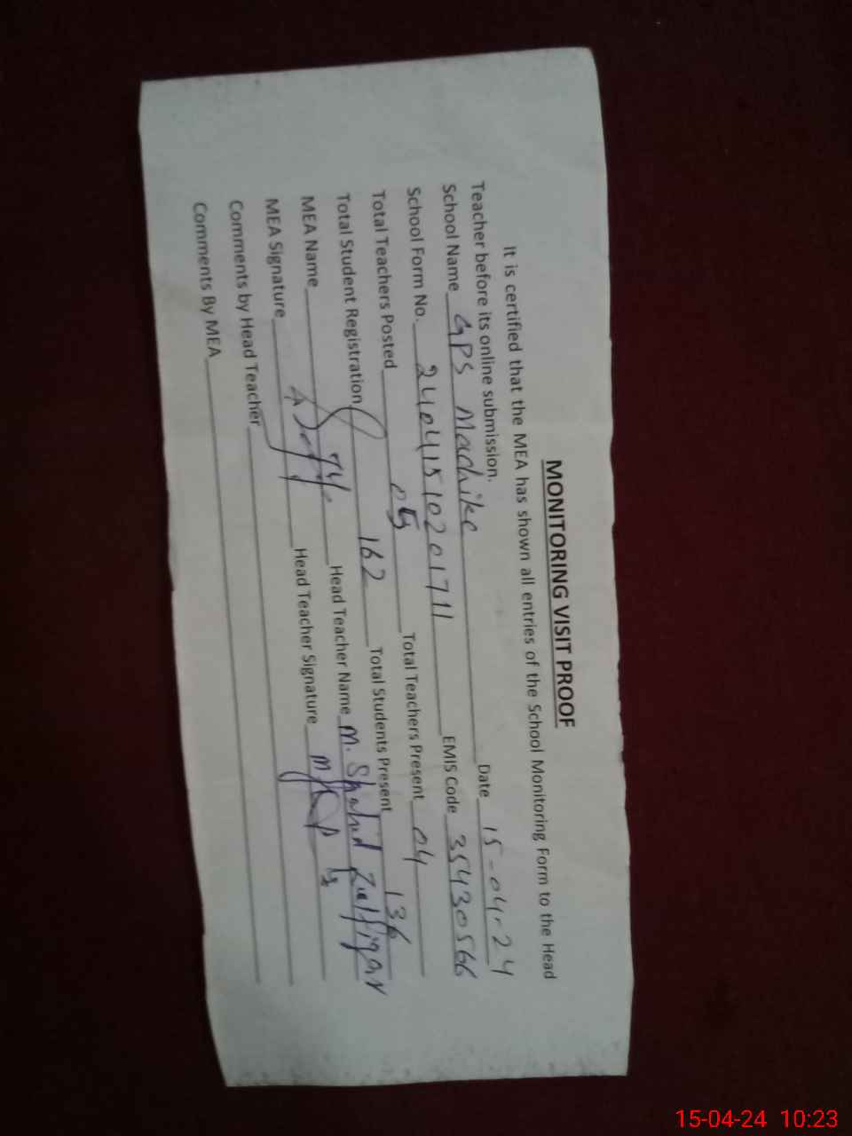 | Attendance Register | Head Teacher | MEA with School | Visit Proof |