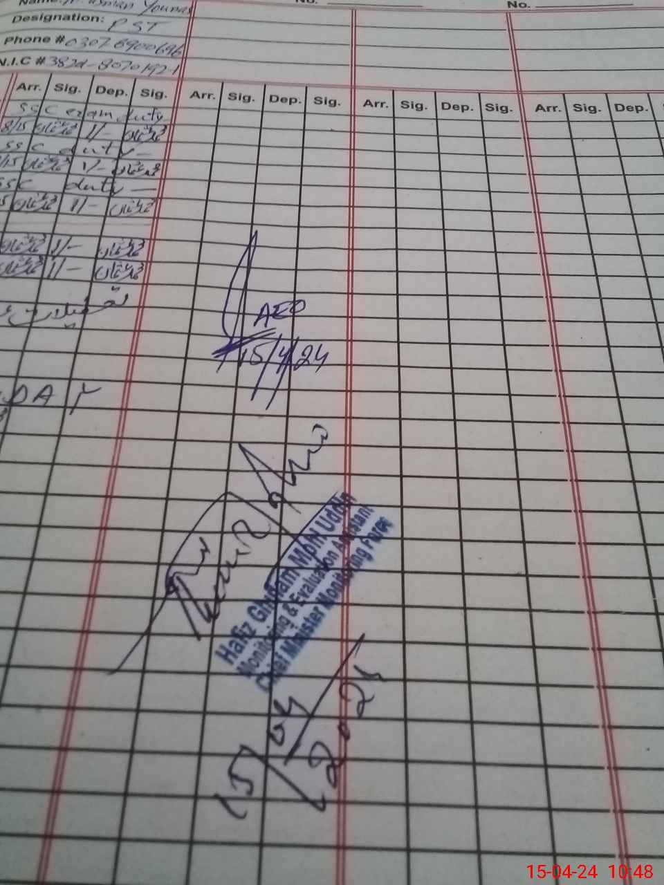 | CNIC | Full Name | Designation | R/C | Absence During Last Calender Month |