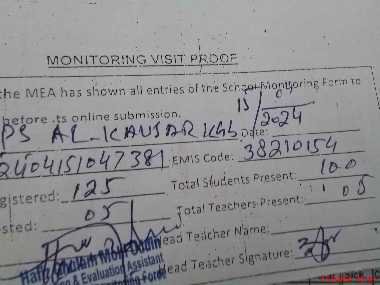 | Attendance Register | Head Teacher | MEA with School | Visit Proof |