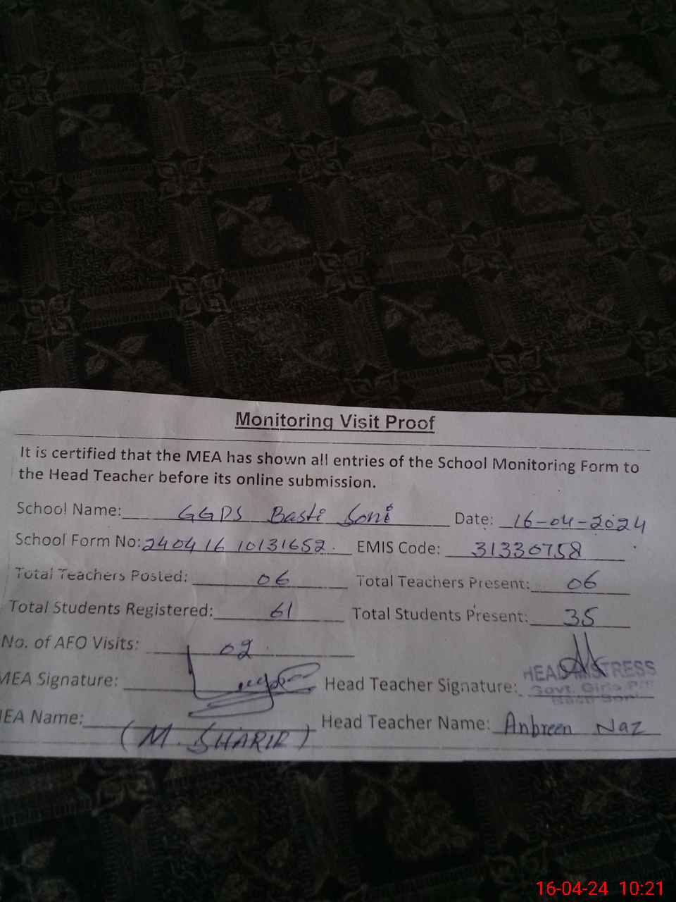 | Certified that this School was Inspected by the Undersigned MEA/DMO Today and the Information Stated Above is as Per Record. | |||||