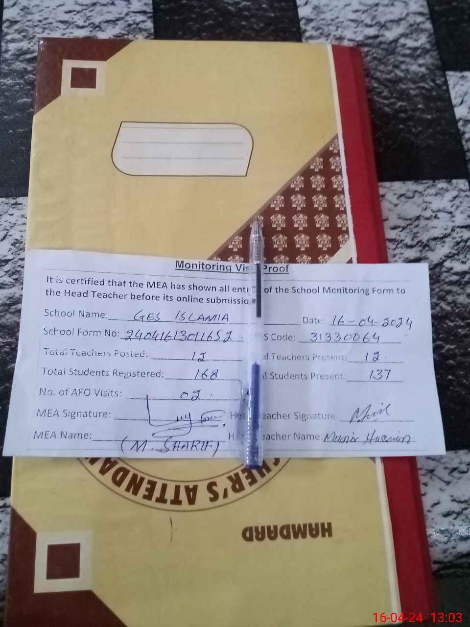 | Attendance Register | Head Teacher | MEA with School | Visit Proof |