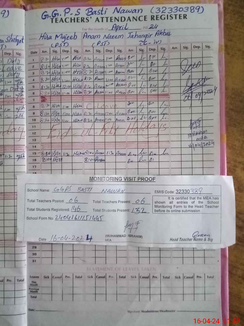 | Attendance Register | Head Teacher | MEA with School | Visit Proof |