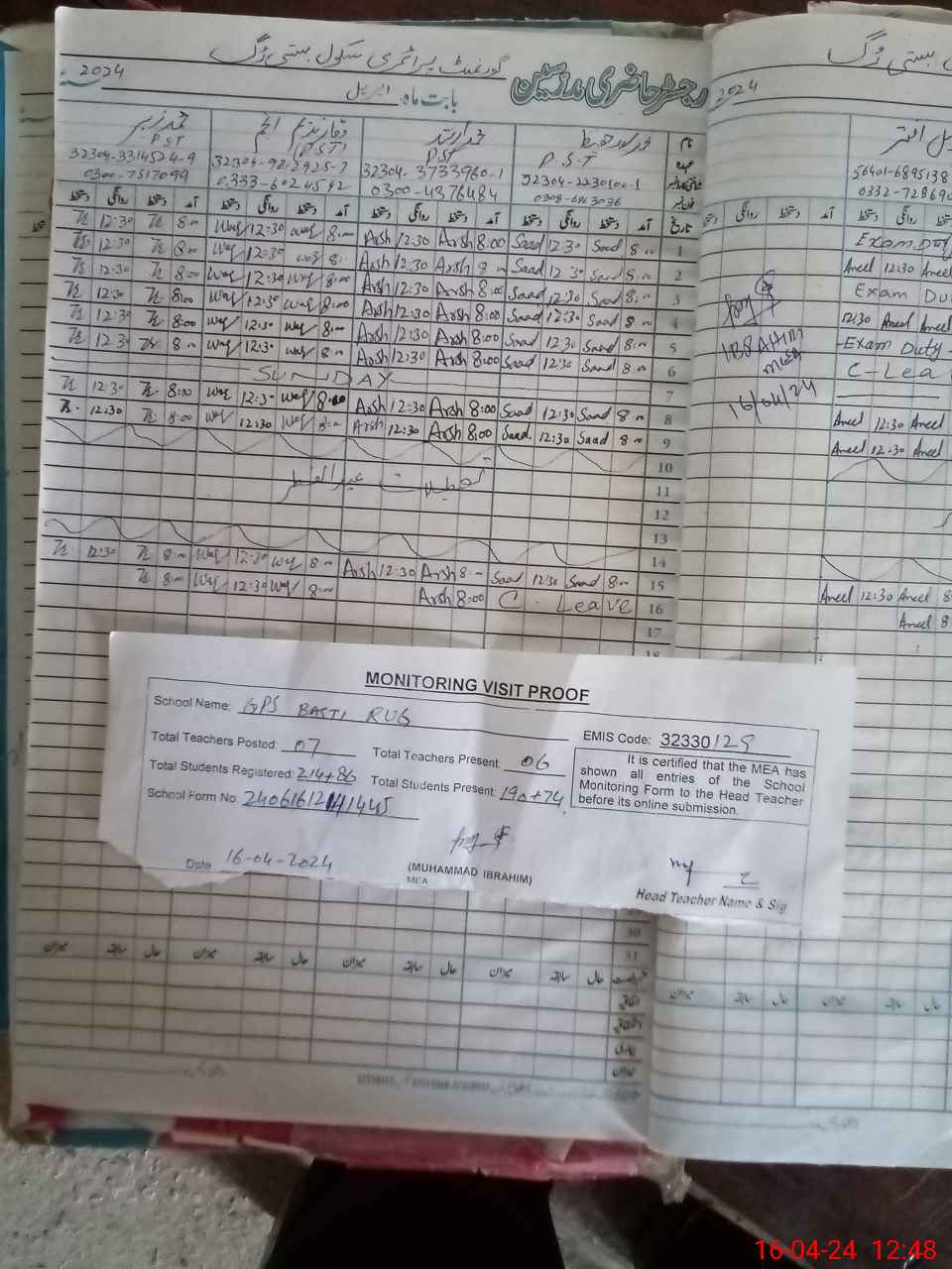 | Name: IR**** HU**** Designation: (School Headmaster's/Headmistress's) PST/PTC/JV Phone/Cell Number: 03**** |