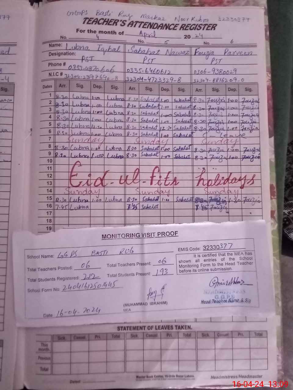 | Attendance Register | Head Teacher | MEA with School | Visit Proof |