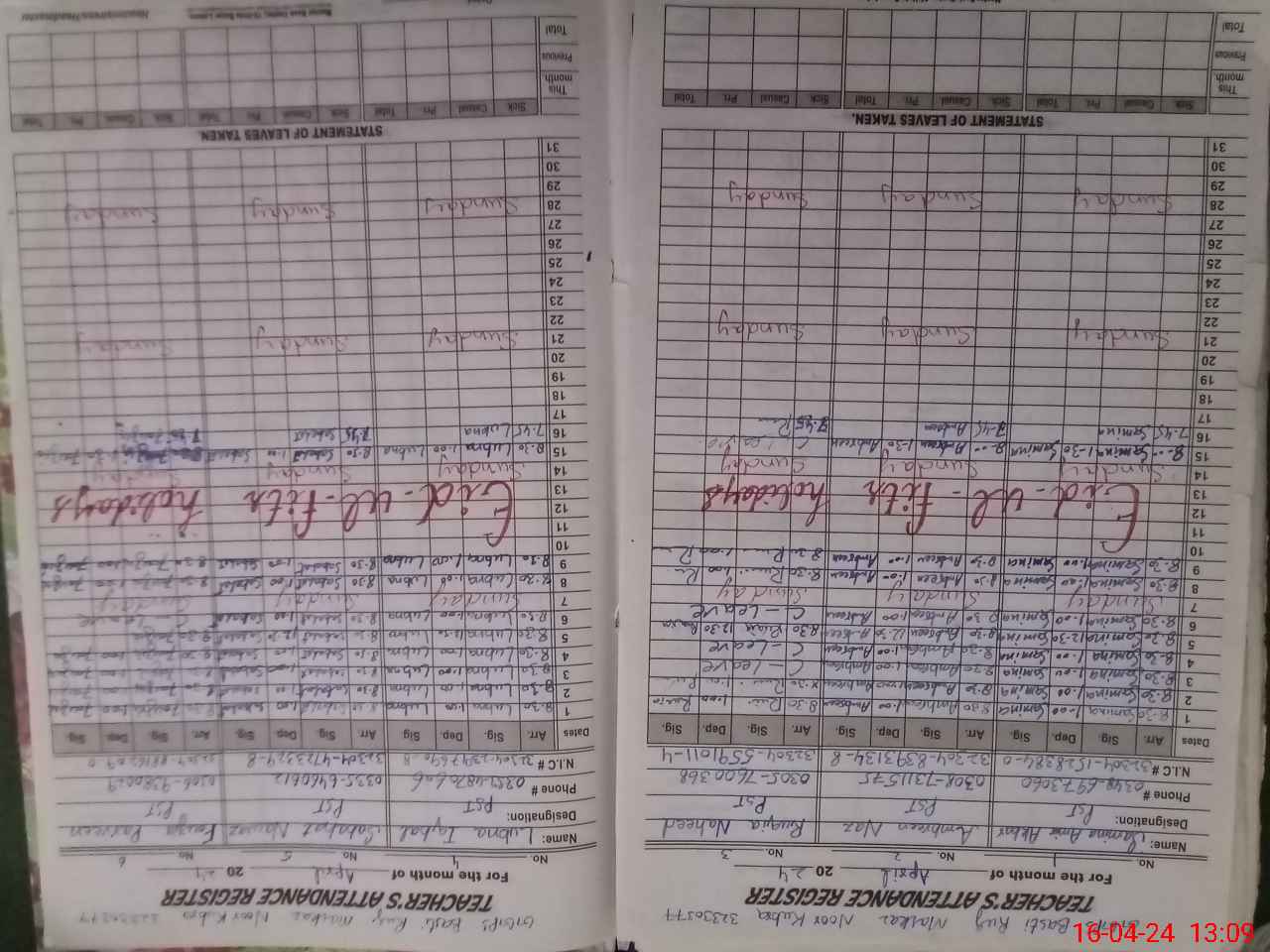| CNIC | Full Name | Designation | R/C | Absence During Last Calender Month |