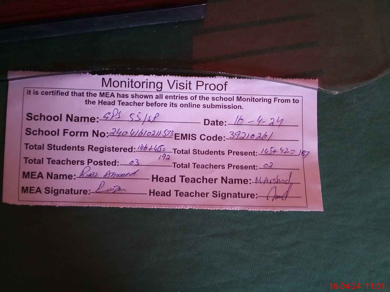 | Attendance Register | Head Teacher | MEA with School | Visit Proof |