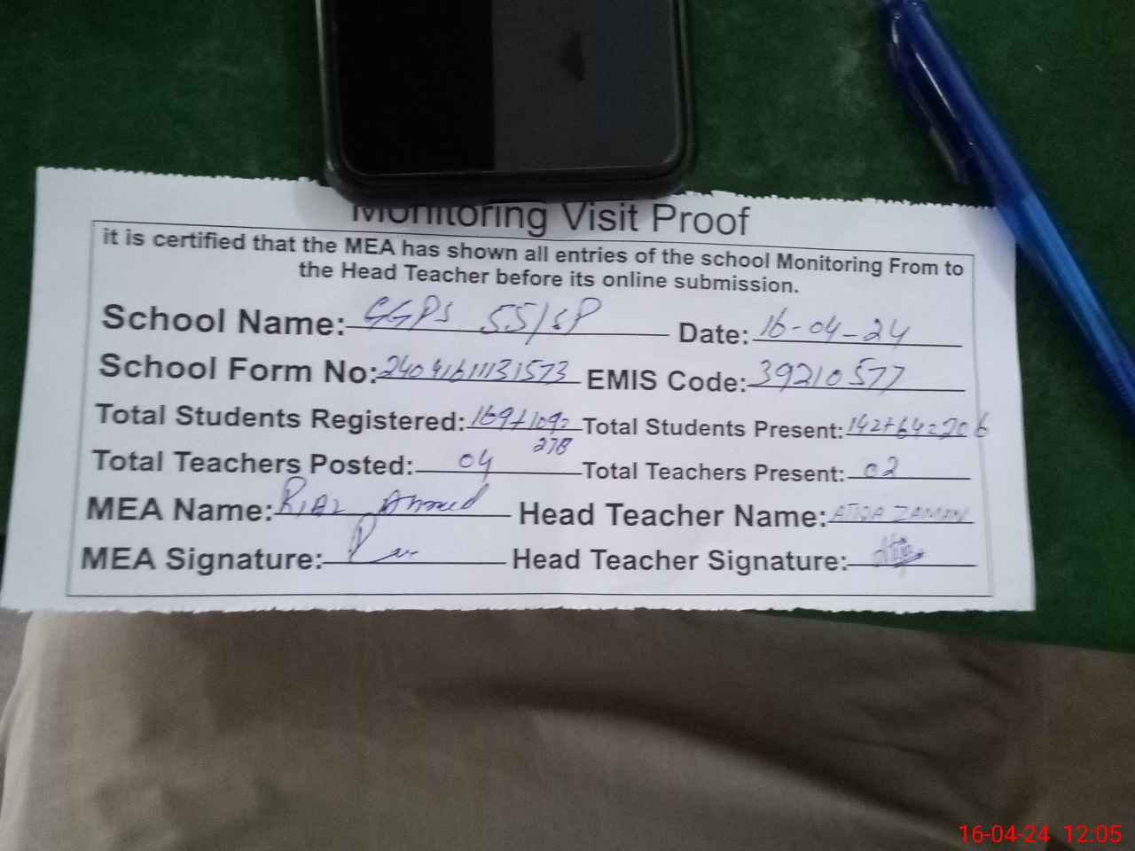 | Attendance Register | Head Teacher | MEA with School | Visit Proof |